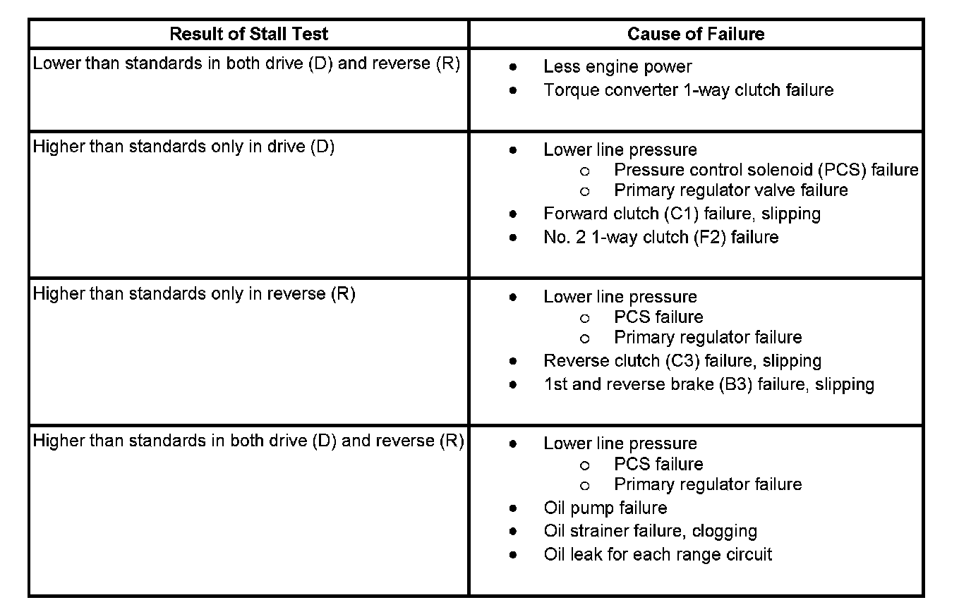 The purpose of the stall test is to inspect overall performance of the A/T and the engine by measuring the stall speed in drive (D) and reverse (R) range.