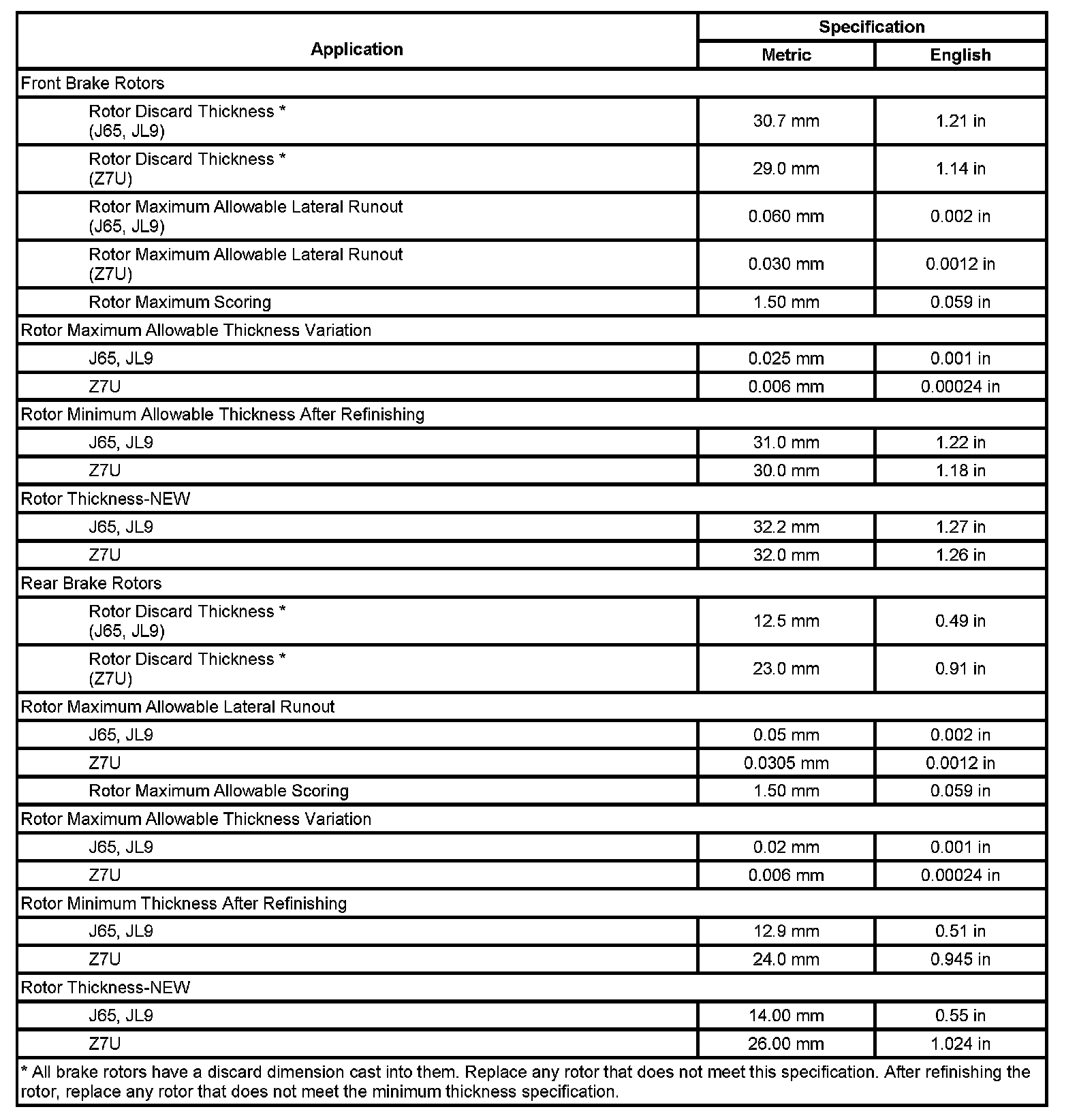 Disc Brake Component Specifications: