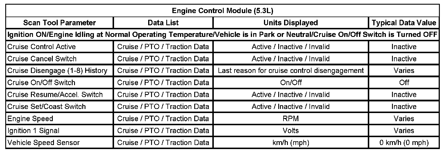 The scan tool data lists contain all of the cruise control related parameters that are available on the scan tool. The parameters in the list are arranged in alphabetical order. The data list column indicates the location of the parameter within the scan tool menu selections.
