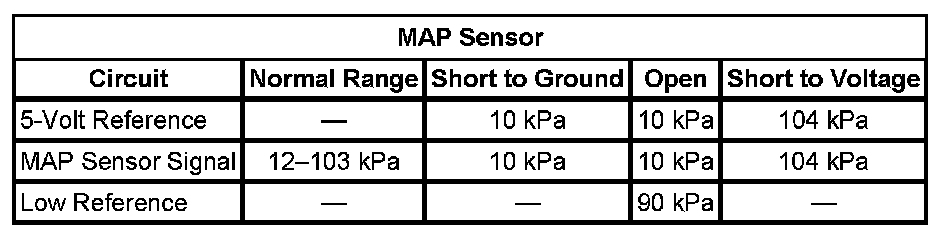 ^ If the MAP sensor is less than 103 kPa, then test the MAP sensor signal circuit for a short to ground, an open, high resistance. If the circuit tests normal, replace the control module.