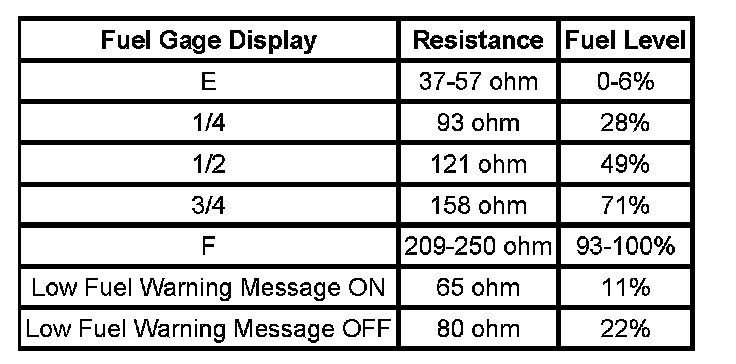 The information in this table is intended for use with the J 33431-C Signal Generator and Instrument Panel Tester. The fuel level sensor values represent the test values to be used on the Signal Generator to drive the fuel gage display to the indicated positions. Vehicles that require more than one fuel level sensor calculate gage position from many possible resistance combinations of fuel levels between the two tanks. Therefore, the values in the table may not correlate directly to readings taken from the vehicle primary or secondary sending units.