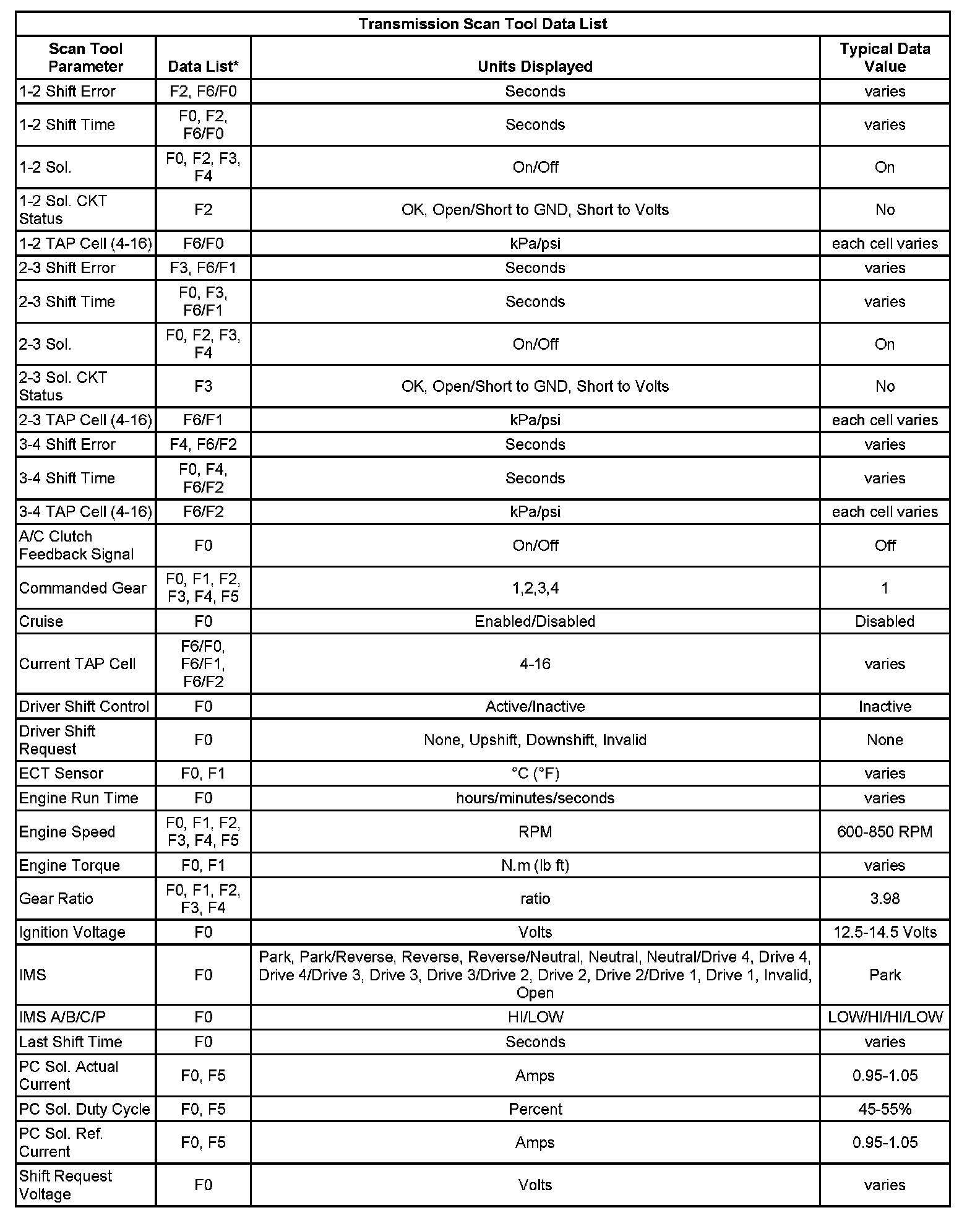 Only the parameters listed below are used in this service data for diagnosing. If a scan tool displays other parameters, the values are not recommended by General Motors for use in diagnosis.