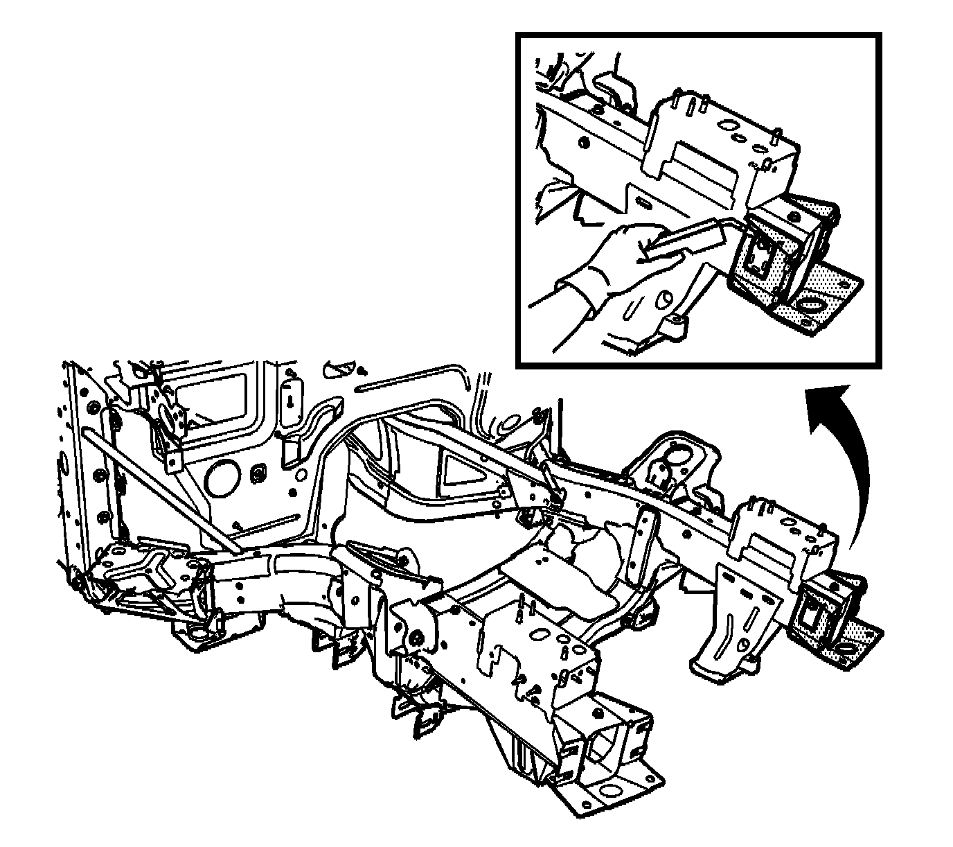 1. Locate and remove all factory welds attaching the front bumper bracket to the frame rail. Note the number and location of the welds for installation of the new bracket.
