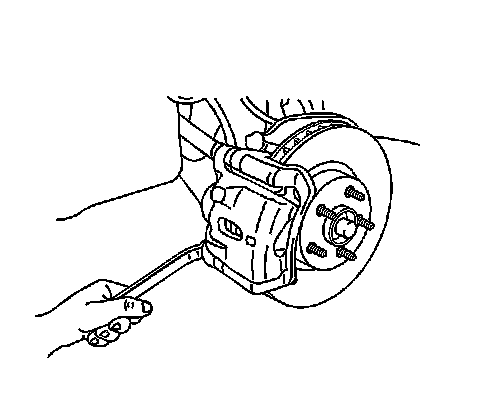 Notice: Support the brake caliper with heavy mechanic wire, or equivalent, whenever it is separated from its mount and the hydraulic flexible brake hose is still connected. Failure to support the caliper in this manner will cause the flexible brake hose to bear the weight of the caliper, which may cause damage to the brake hose and in turn may cause a brake fluid leak.