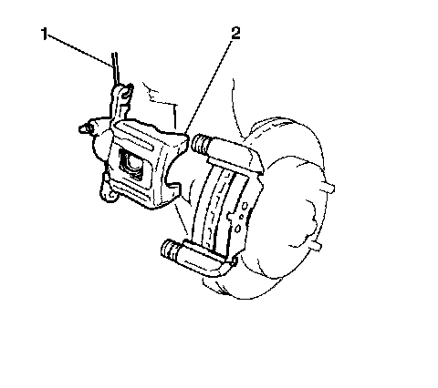 8. Remove the caliper housing (2) from the caliper bracket. Support the caliper with a wire (1) in order to prevent damage to the brake hose.