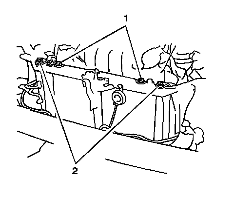 5. Remove the 2 bolts (2) from the radiator support bracket.