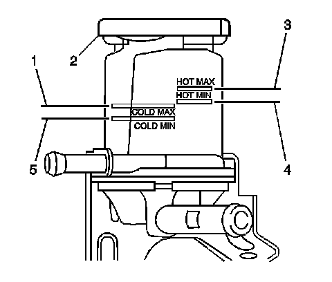 9. Add fluid to the reservoir in order to keep the fluid level above the COLD MIN mark (5).