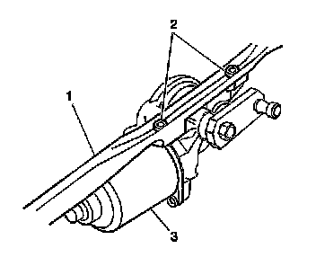 Install the 2 torx bolts (2) which secure the wiper transmission (1) to the wiper motor (3).
