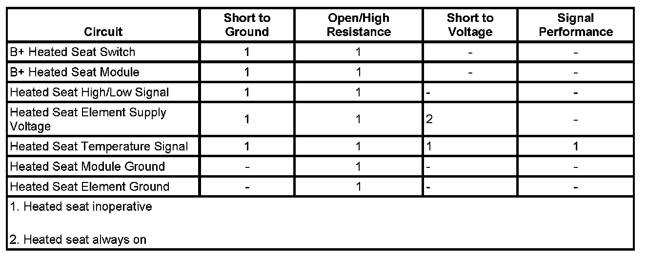 ^ If not within the specified range, test the control and supply voltage circuits for a short to ground or open/high resistance. If the circuits test normal, test or replace the heated seat element - cushion.