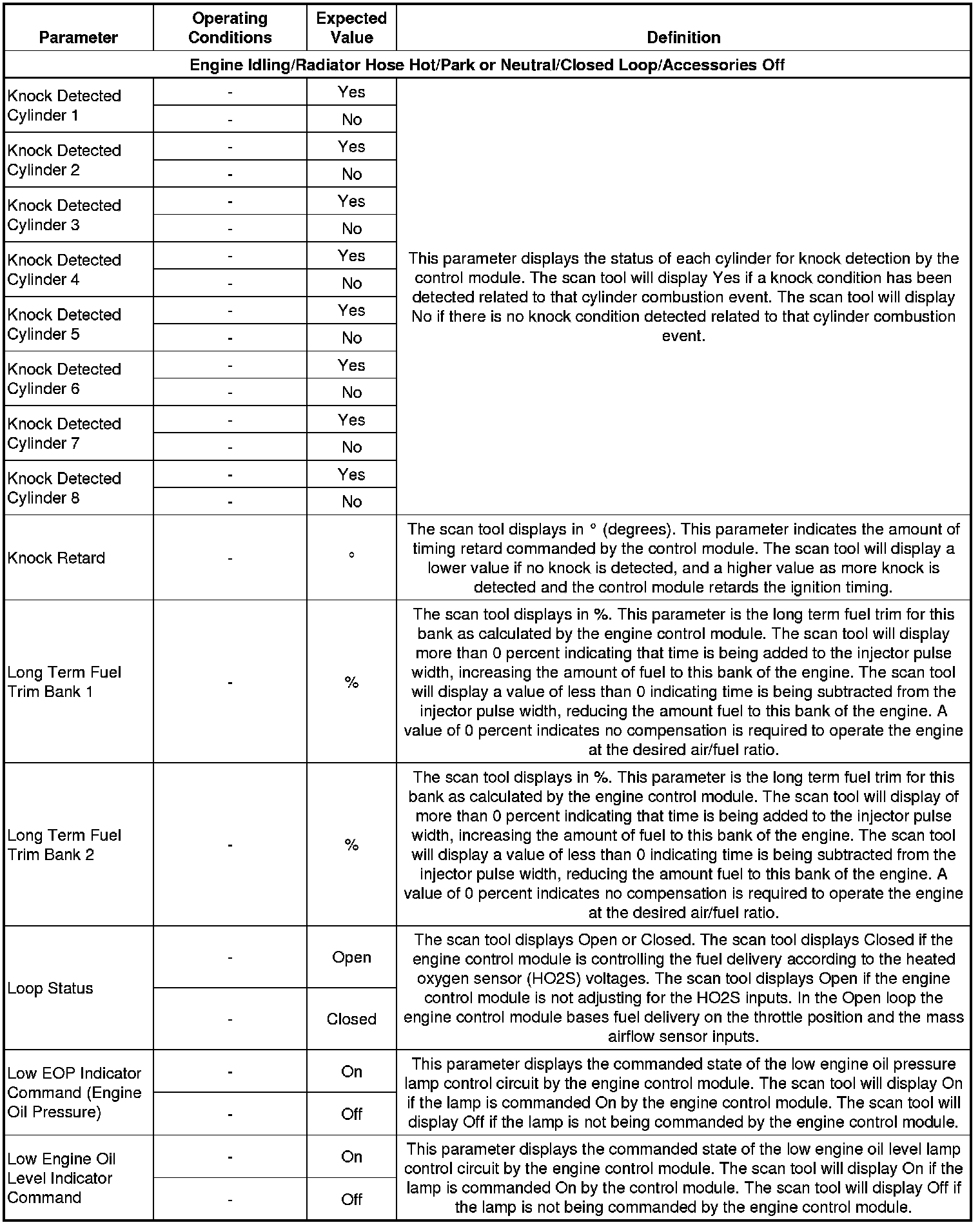 The Engine Scan Tool Data List contains all engine related parameters that are available on the scan tool. The list is arranged in alphabetical order. A parameter may appear in any one of the data lists and in some cases may appear more than once or in more than one data list in order to group certain related parameters together.