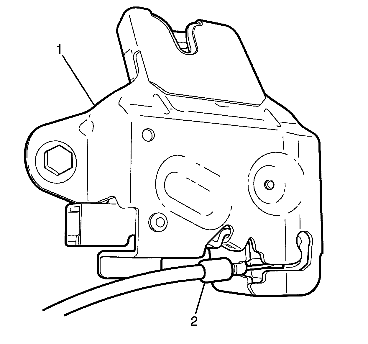 6. Disconnect the rear compartment lid release cable (2) from the rear compartment lid lock actuator (1).