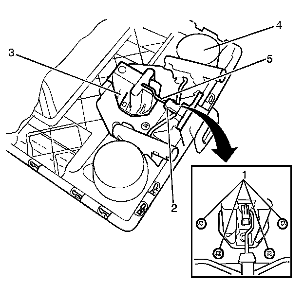 5. Carefully guide the rear forward folding seat latch assembly linkage (5) out of the release button (2) cavity.