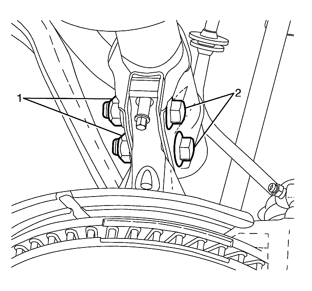9. Tighten the strut assembly to steering knuckle retaining bolts (2) and nuts (1). Tighten the bolts a first pass to 85 Nm (63 lb in). Tighten the bolts a second pass to 100 Nm (74 lb in). Tighten the bolts an additional 90 degrees.