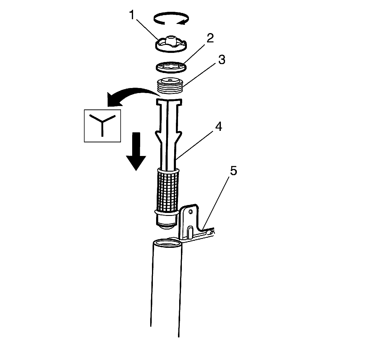 Note: Gently push the radiator and condenser towards the engine to allow removal of the plastic screw cap (1) on the right side of the condenser (5).