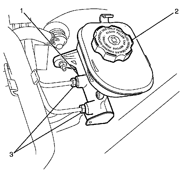 7. Disconnect brake lines (3) from the master cylinder (1), then remove master cylinder reservoir cap (2).