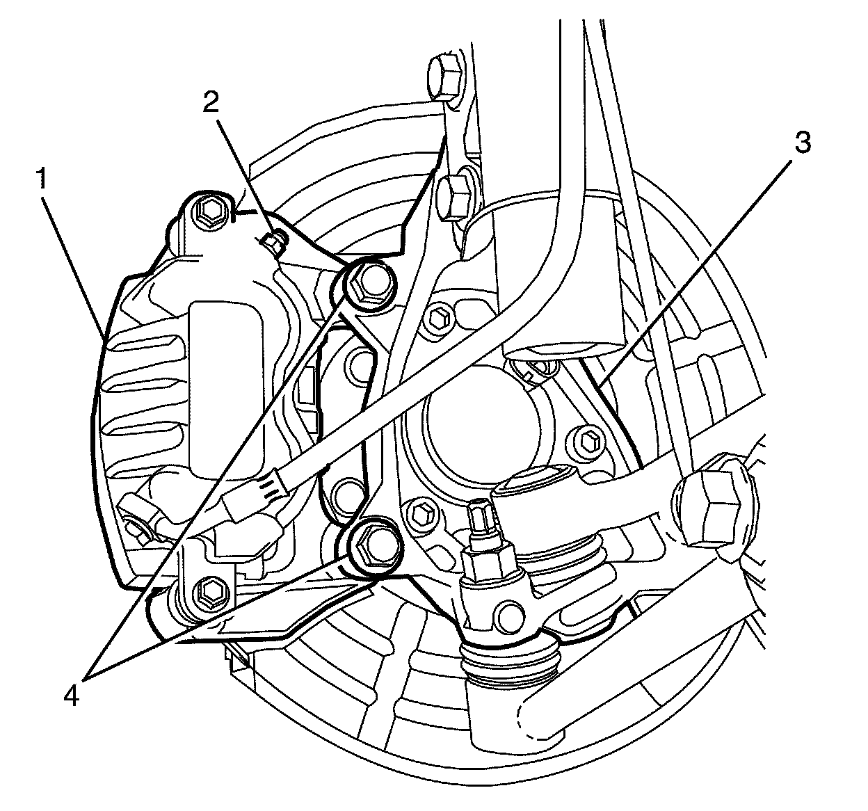 13. Remove the left-side front brake calliper anchor plate to knuckle retaining bolts (4).