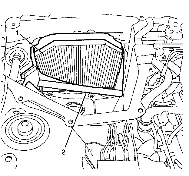 Note: Twist and collapse the pollen filter (1) and position the pollen filter (1) in the pollen filter housing (2) lower retaining grooves. Release the twist in the pollen filter (1) and seat the pollen filter (1) in the pollen filter housing (2) upper retaining grooves.