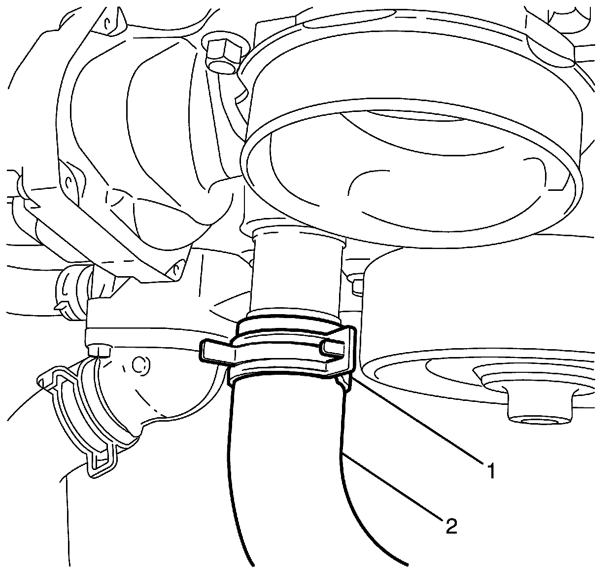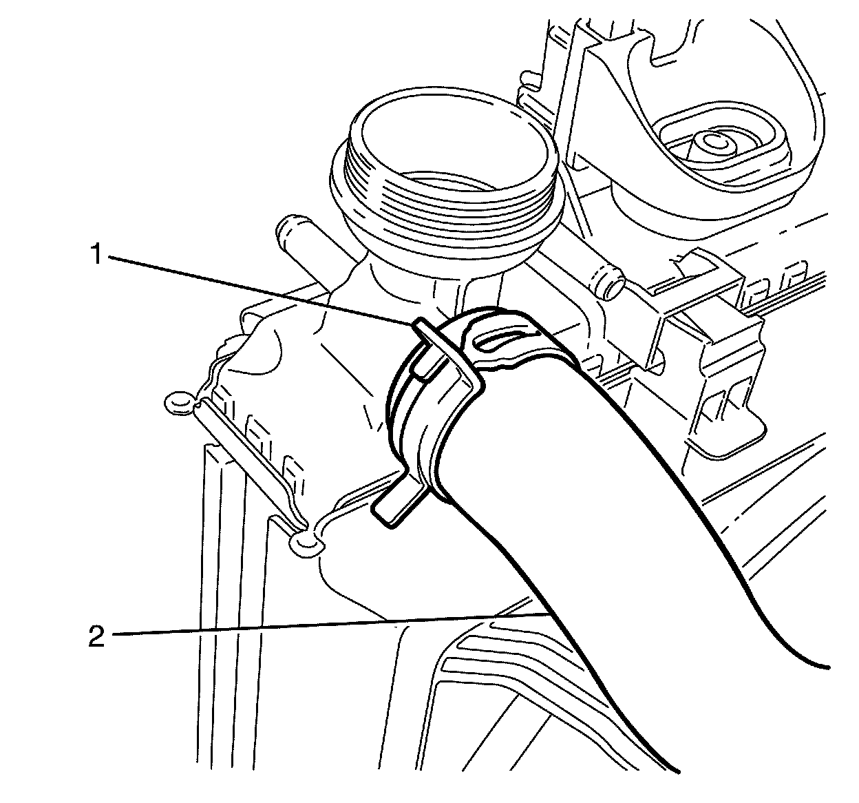 3. Secure the hose (2) at the radiator end by opening the retaining hose clamp (1) and retaining it over the hose (2).