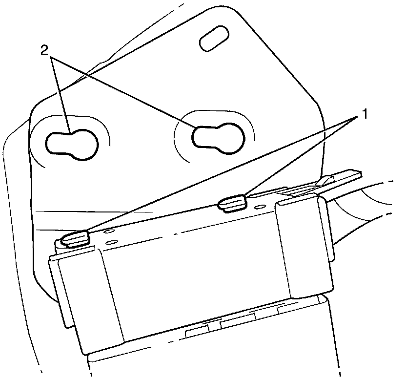 Note: To remove the fuse box, the locking tabs (1) must be released. Push the fuse box towards the front of the vehicle to allow the fuse box to be released from the battery tray (2).