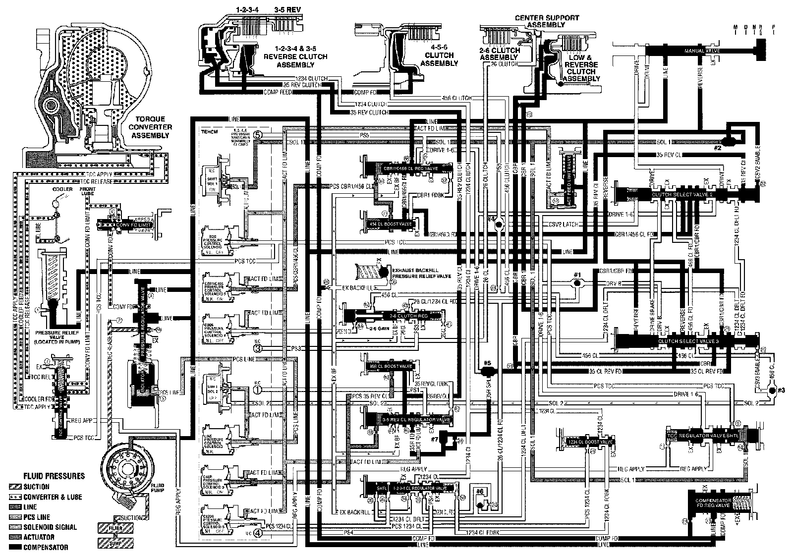 With the manual valve in the reverse position, line pressure is directed into the reverse fluid circuit to the #2 ball check valve and clutch select valve 3.