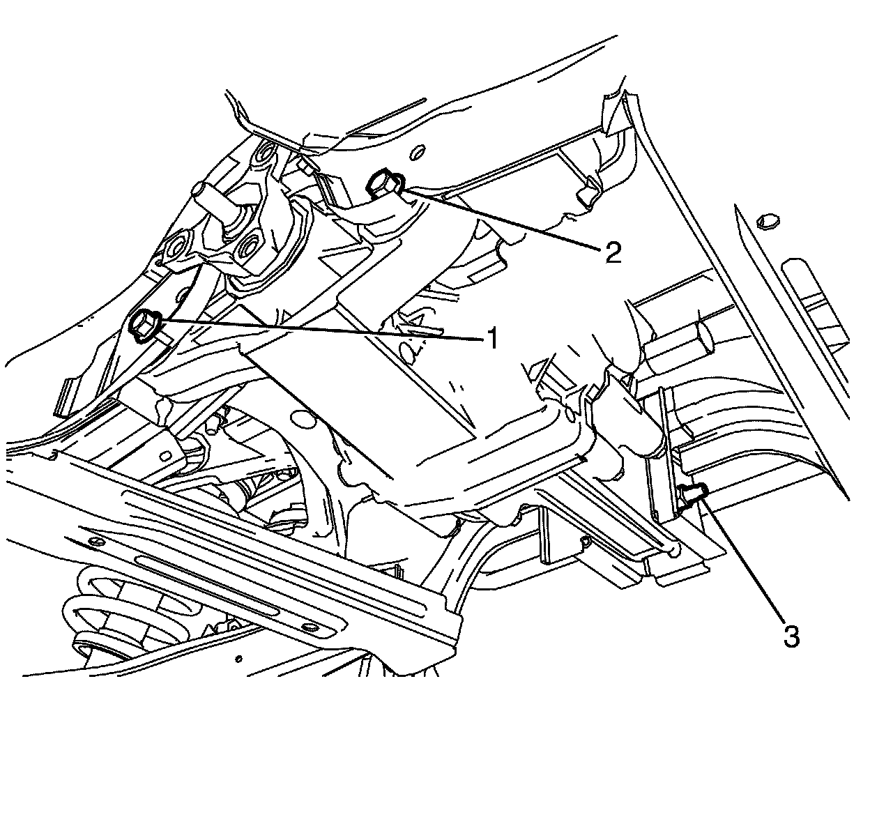 8. Remove the differential retaining bolts and nuts (1, 2, and 3) from the rear suspension.