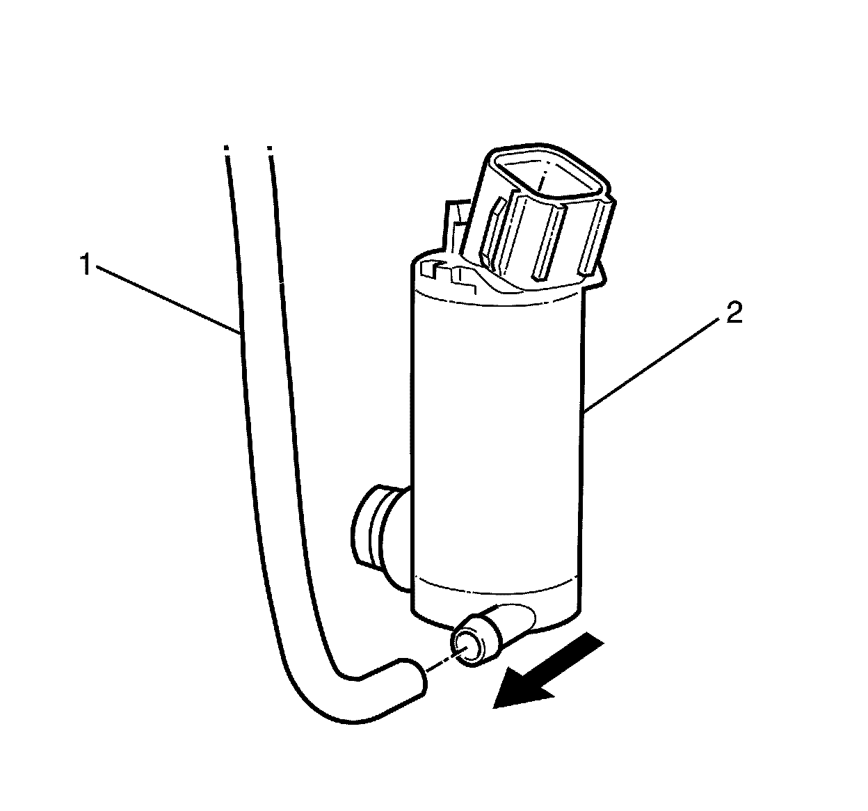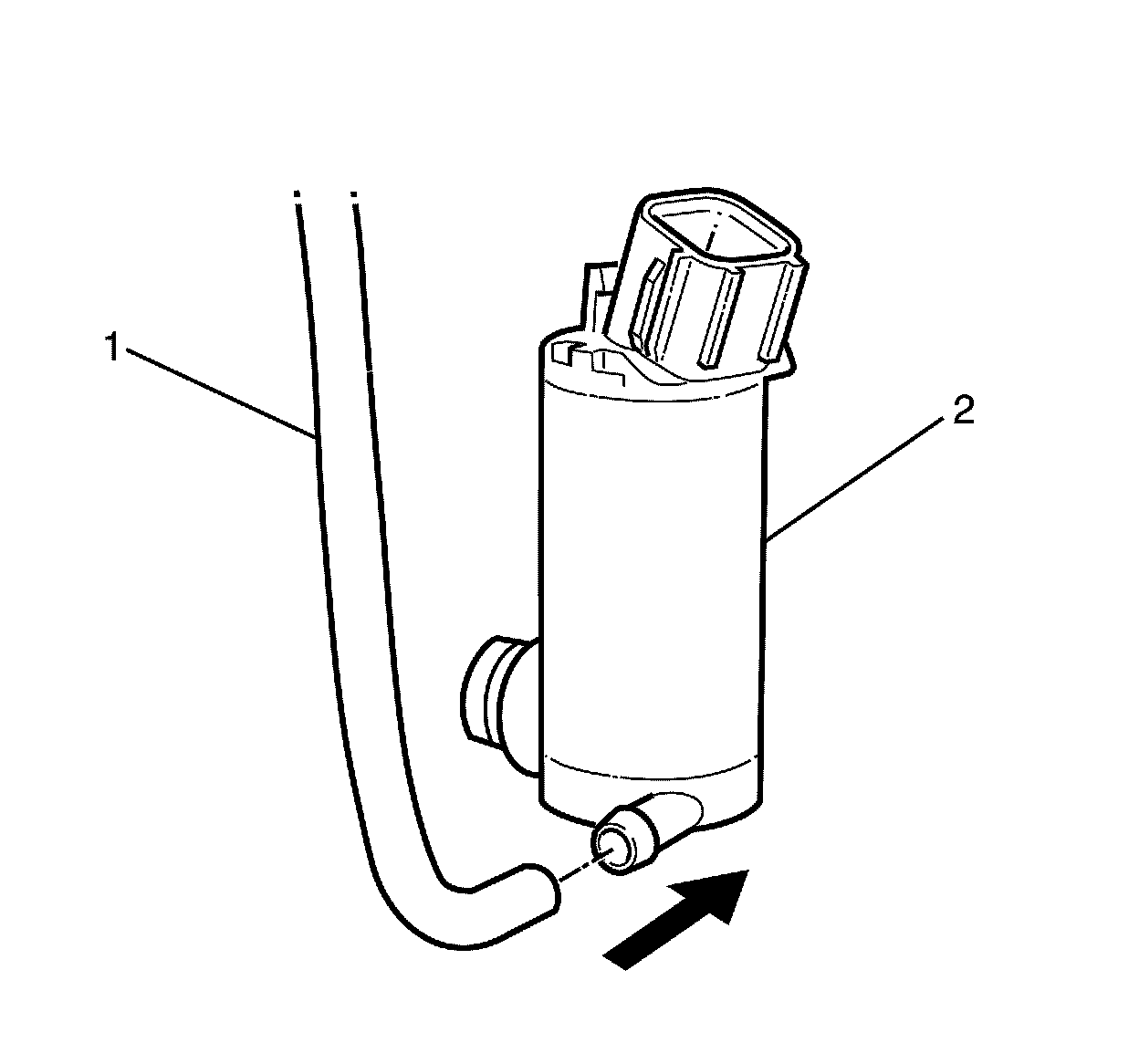 4. Install the washer hose (1) onto the washer pump (2).