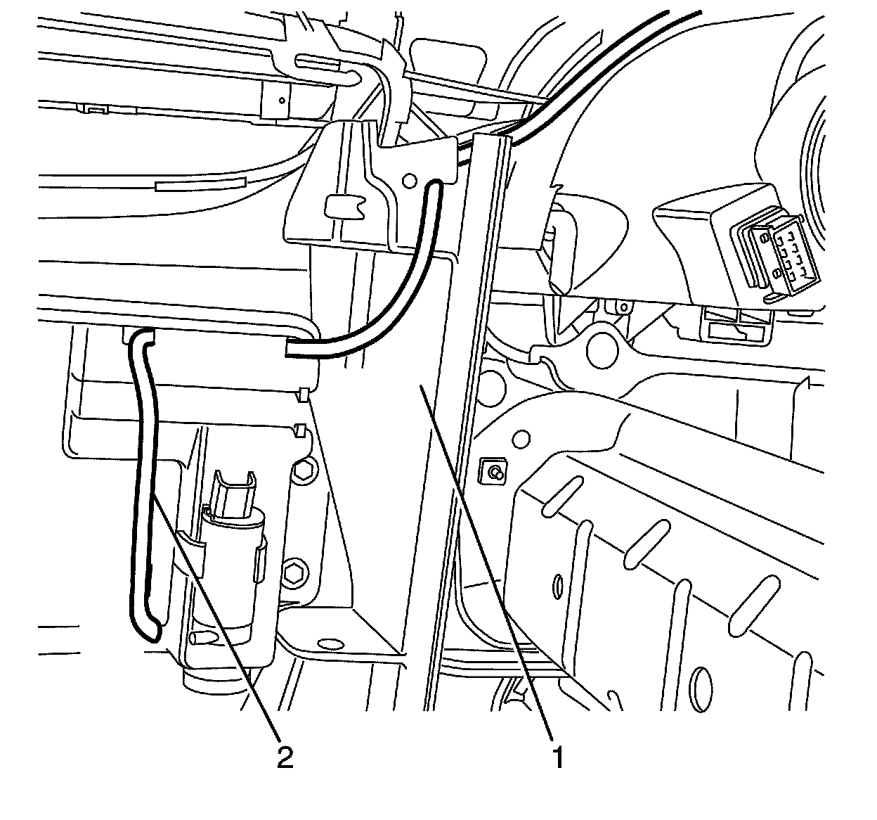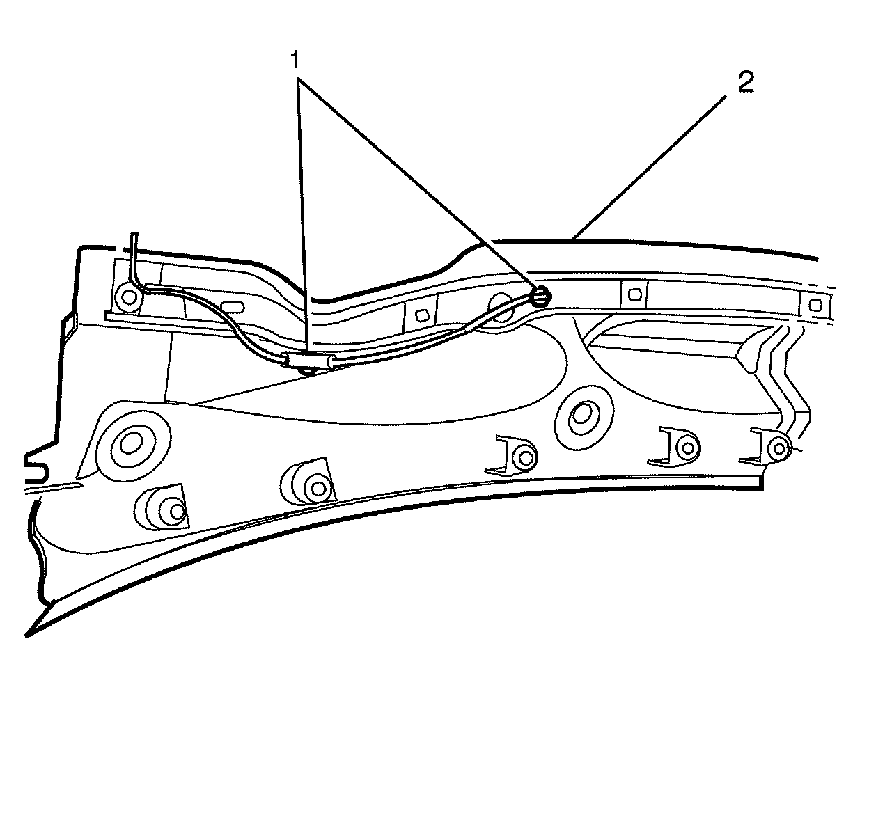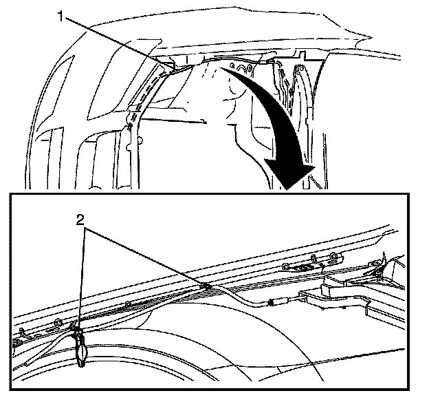 3. Route the washer hose (2) through the radiator air intake baffle (1).
