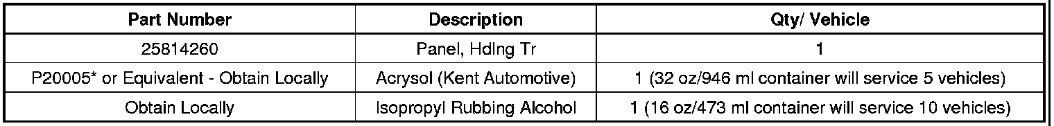 Panels required to complete this service update are to be obtained from General Motors Service and Parts Operations (GMSPO). Please refer to your "involved vehicles listing" before ordering parts. Normal orders should be placed on a DRO = Daily Replenishment Order. In an emergency situation, parts should be ordered on a CSO = Customer Special Order. This part number is not eligible for RIM management. There are a limited number of pieces available, due to the low involved vehicle population. Please only order what you will need to service your specifically involved vehicles.