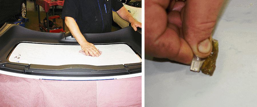 4. Remove any adhesive residue from the contact area of the roof panel using Acrysol P/N P20005 (or equivalent), a shop towel, and razor blade.
