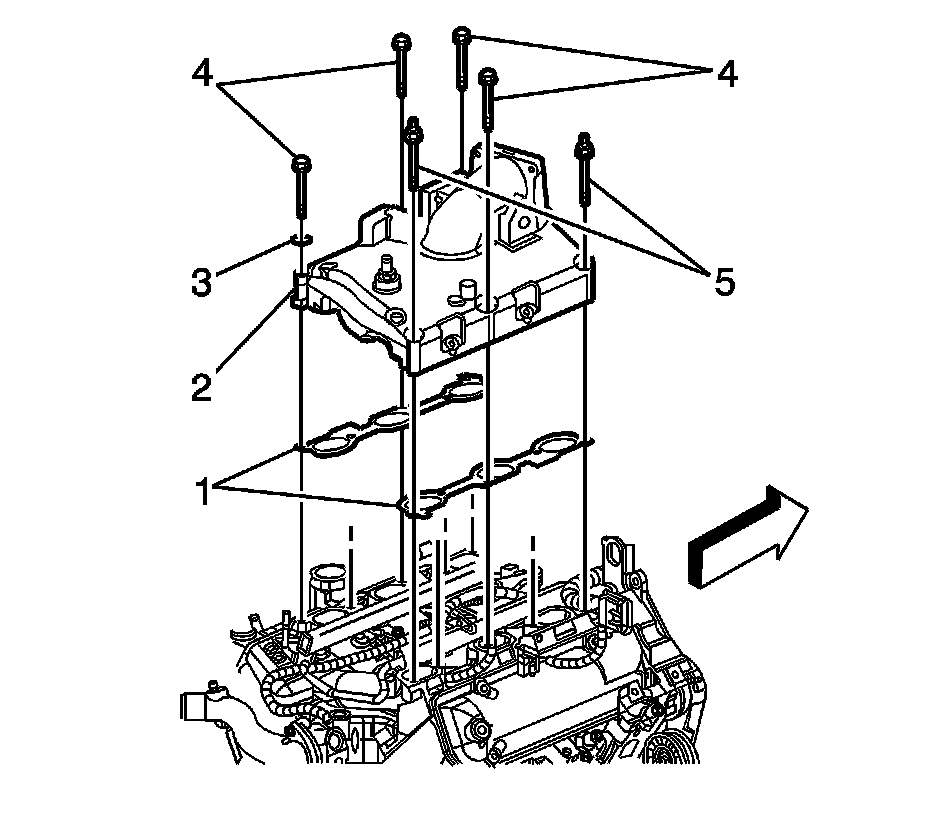 4. Apply threadlock GM P/N 12345382 (Canadian P/N 10953489) to the bolt threads. Install the upper intake manifold bolts (4, 5) and tighten to 25 Nm (18 lb ft).