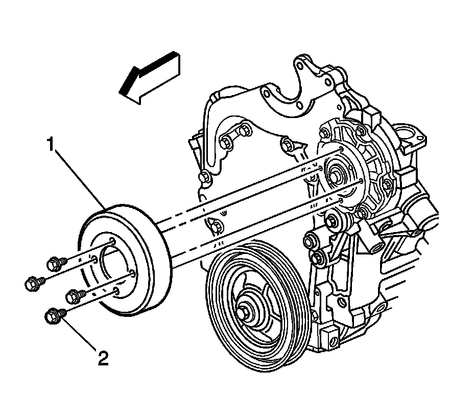 4. Install the water pump pulley (1). Loosely install the pulley bolts (2).