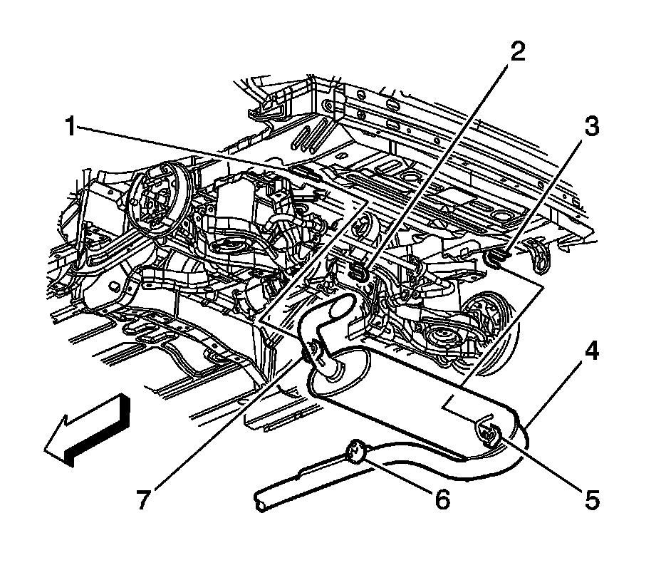 1. Position the exhaust system (4) to the vehicle and install the rubber isolators (5, 6, 7) to the hangers (1, 2, 3).