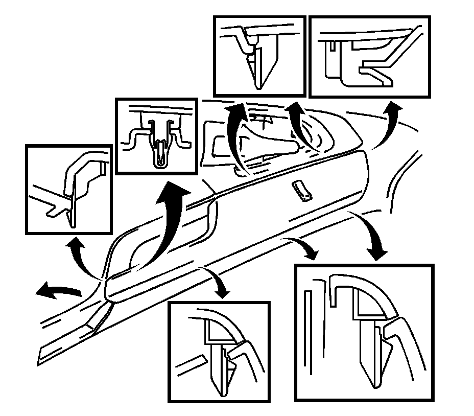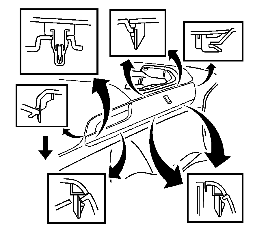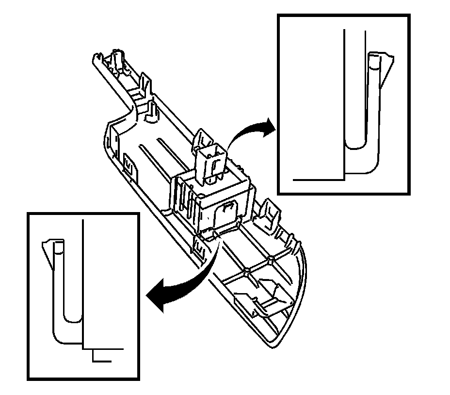 1. Using a taped flat bladed tool, gently disengage the clip and the seven retainers of the side door power lock switch mounting plate, and slide rearward from the front side door trim.