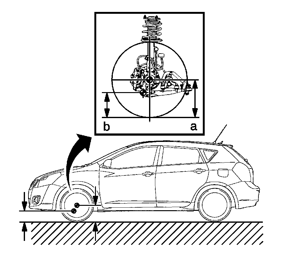 4. Measure from the center line of the front lower control arm front bolt to the ground (b).