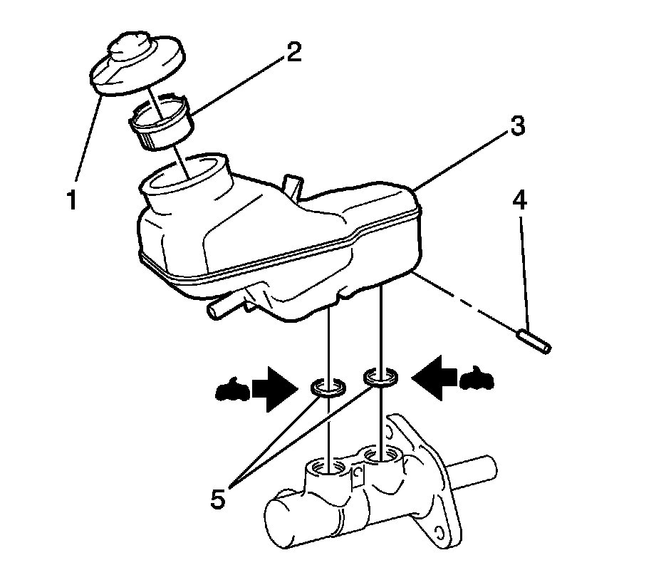 2. Inspect the master cylinder reservoir cap (1) and the reservoir-to-master cylinder grommets (5) for swelling, indicating brake fluid contamination.