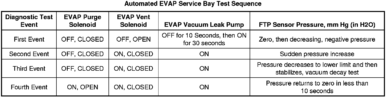 The EVAP service bay test is an automated sequence of four individual EVAP test events. The following table provides an overview of each event: