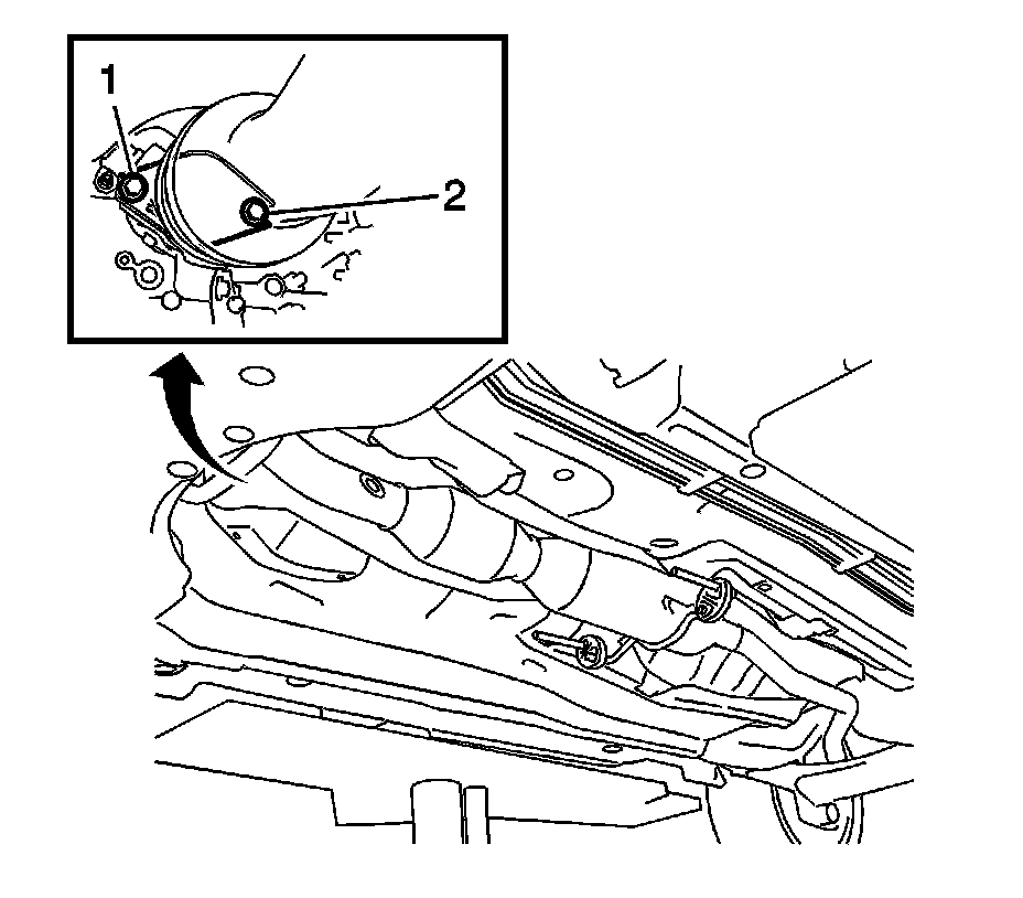 5. Install the front exhaust pipe assembly with the 2 bolts (1, 2) and 2 compression springs. Tighten the bolts to 43 Nm (32 lb ft).
