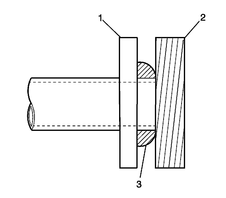 9. Using a plastic hammer and wooden block (2), tap in the new gasket (3) until its surface is flush with the front exhaust pipe assembly (1).
