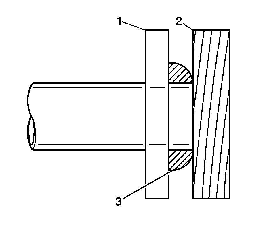 3. Using a plastic hammer and wooden block (2) , tap in the new gasket (3) until its surface is flush with the exhaust manifold.