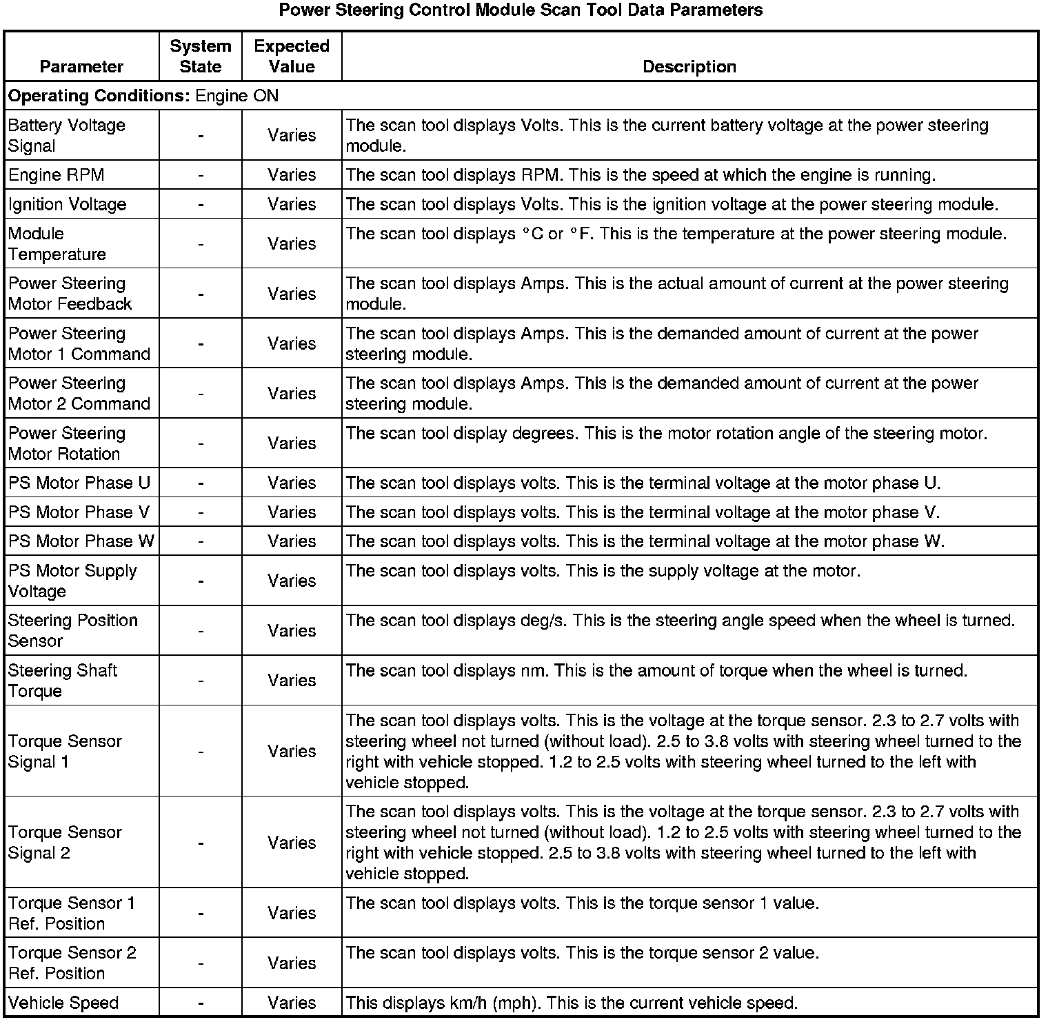 Power Steering Control Module Scan Tool Information