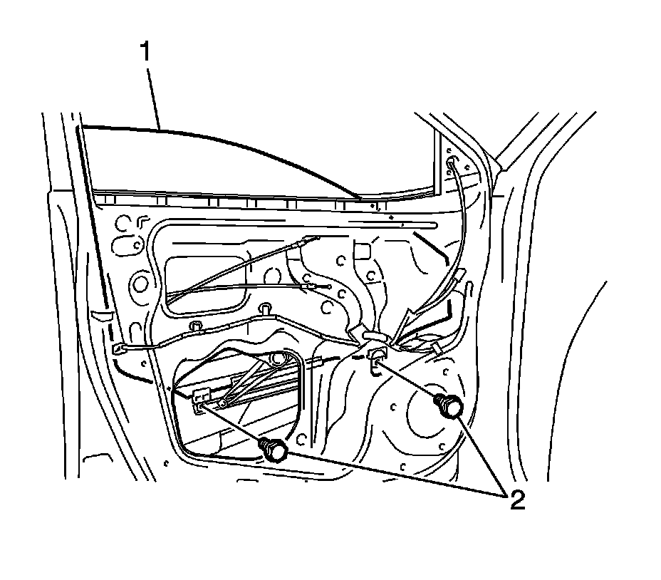 2. Reposition the window (1) and install the bolts (2). Tighten the window-to-regulator bolts to 8 Nm (71 lb in).