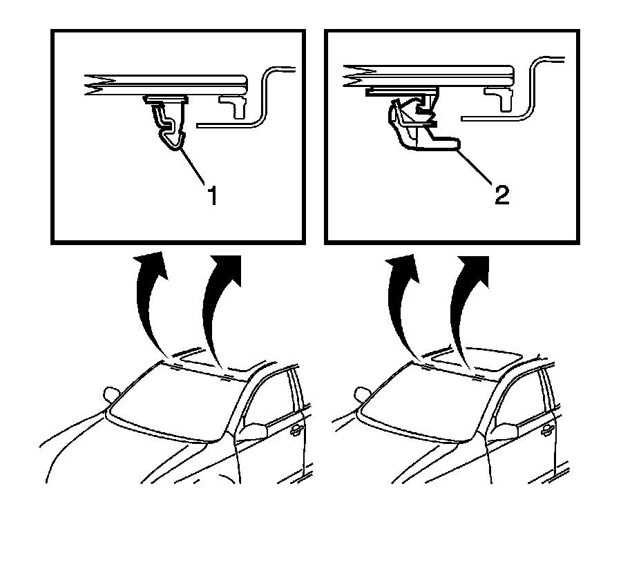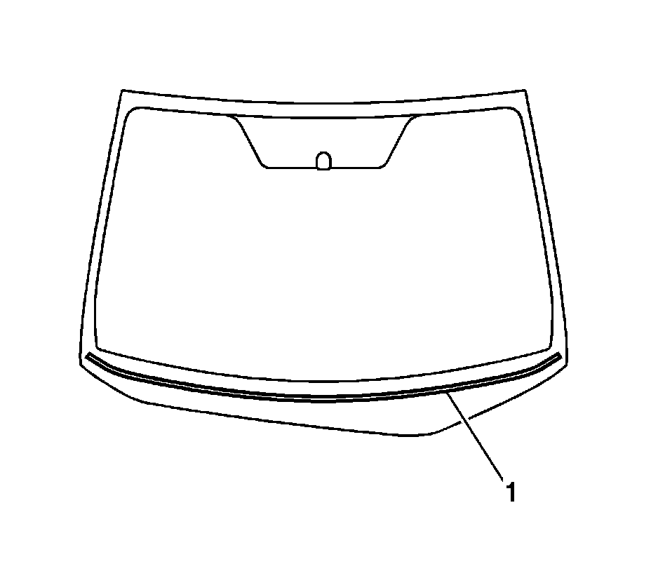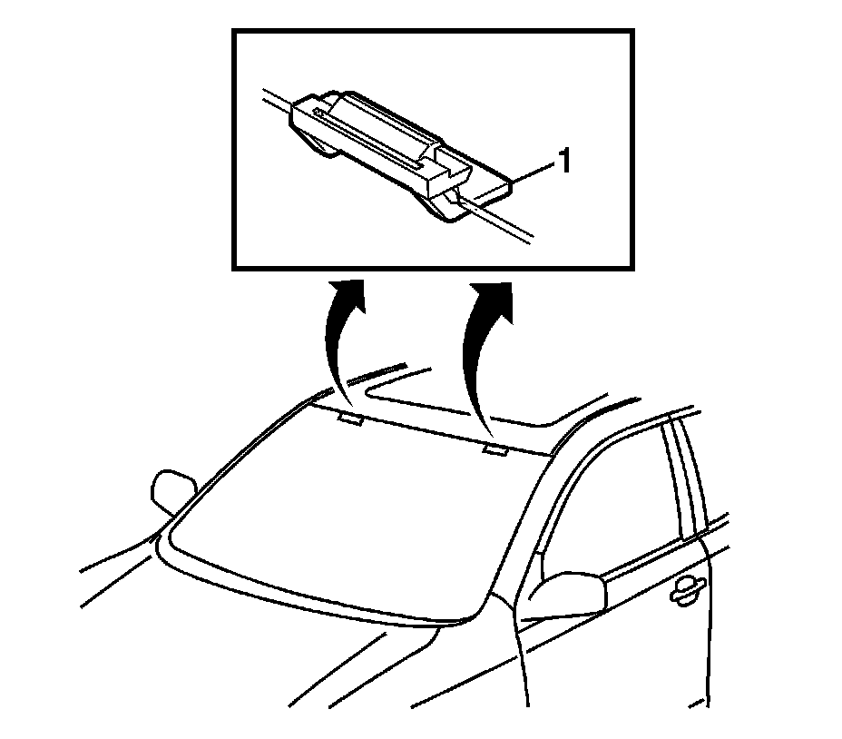 2. Remove the windshield inside garnish moldings (1) from the vehicle. Refer to Windshield Pillar Garnish Molding Replacement (Without Roof Side Rail Restraint) (Service and Repair)Windshield Pillar Garnish Molding Replacement (With Roof Side Rail Restraint) (Service and Repair).