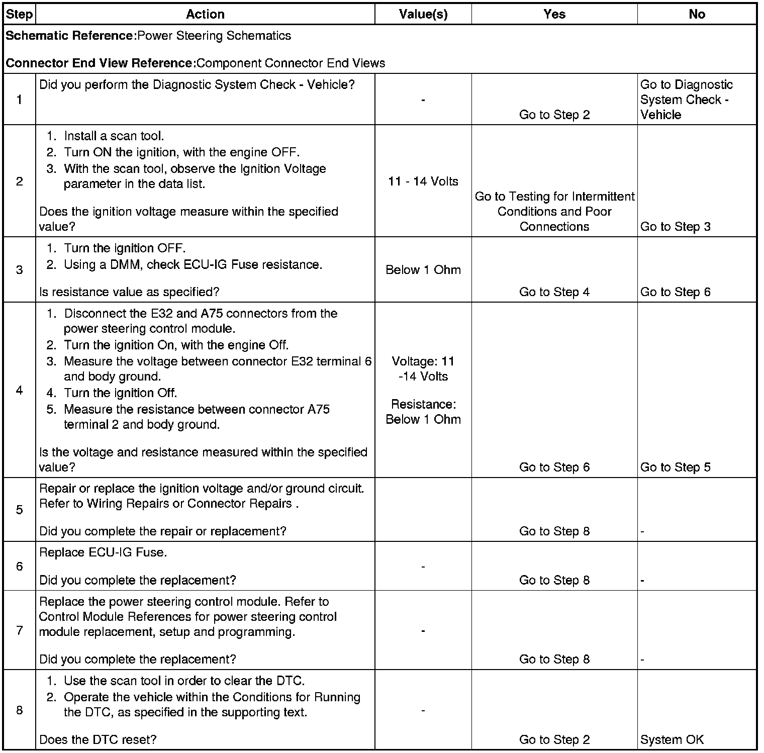 If the steering column or power steering control module has been replaced, the rotation angle sensor initialization and torque sensor zero point calibration, must be performed. Refer to Steering Angle Sensor Initialization and Steering Shaft Torque Sensor Zero Point Calibration (Manual) (Steering Angle Sensor Initialization and Steering Shaft Torque Sensor Zero Point Calibration (Manual))Steering Angle Sensor Initialization and Steering Shaft Torque Sensor Zero Point Calibration (Scan Tool) (Steering Angle Sensor Initialization and Steering Shaft Torque Sensor Zero Point Calibration (Scan Tool)).
