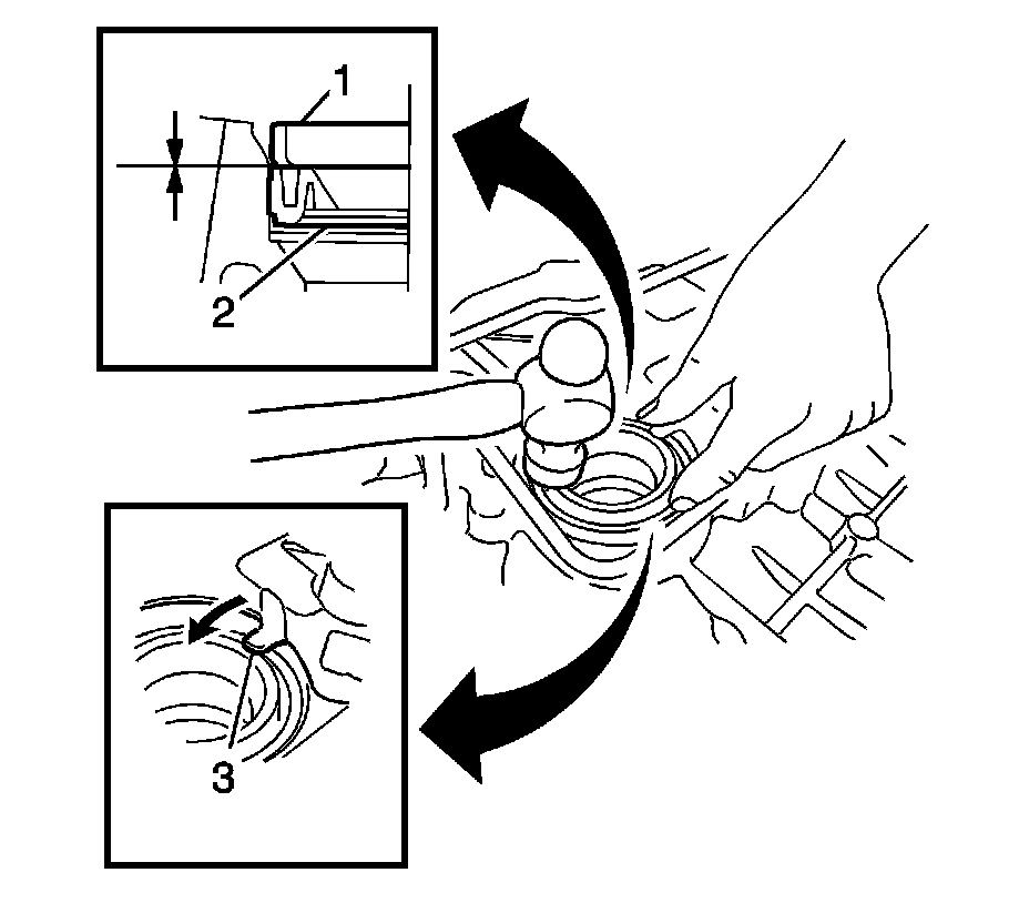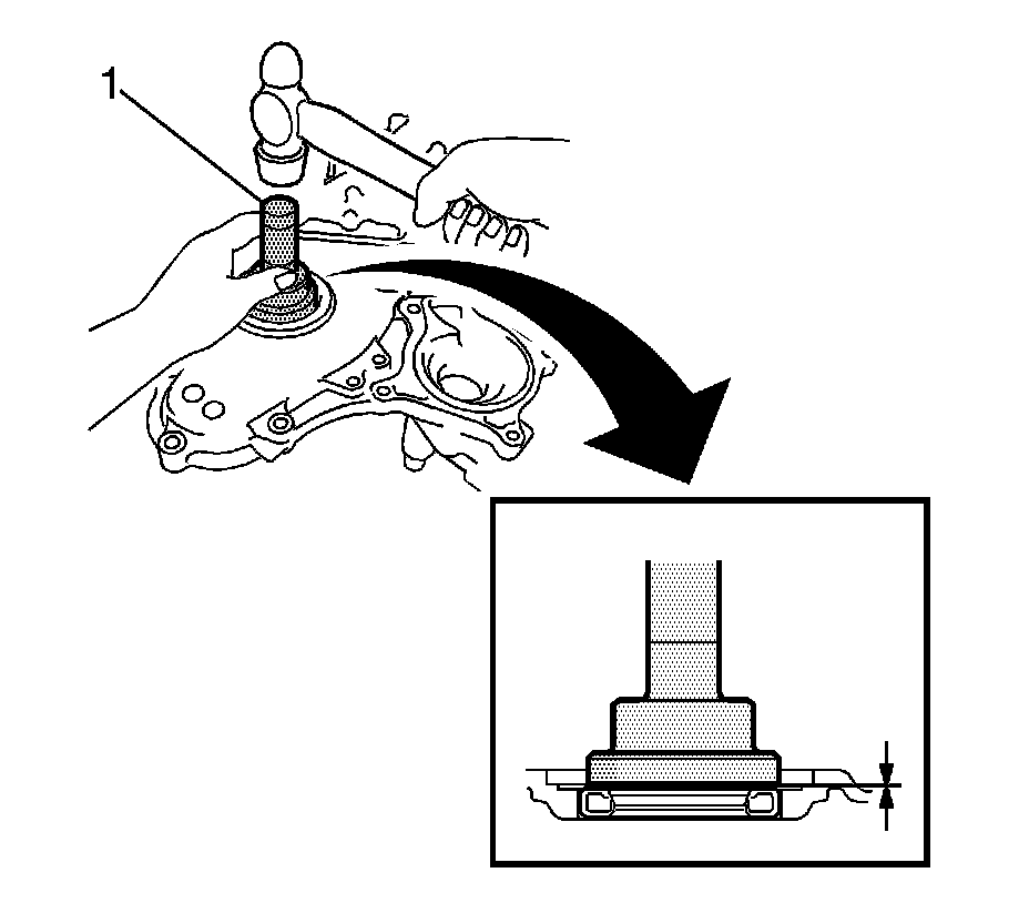 15. Using J-41998-A - installer (1) and a hammer, tap in the oil seal until its surface is flush with the rear oil seal retainer edge.