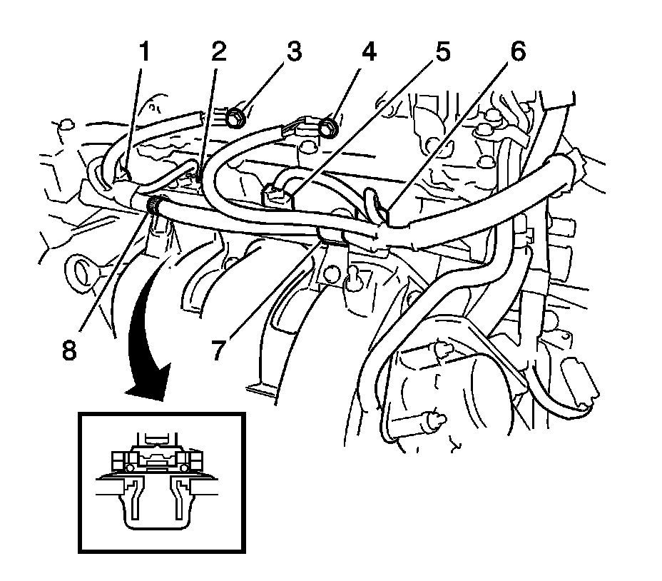 9. Disconnect the 2 wire harness clamps (7, 8).