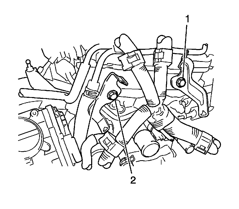 12. Install the 2 wire harness brackets with the 2 bolts (1, 2) and tighten to 13 Nm (10 lb ft).