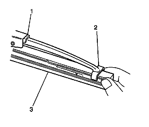 1. Slide the windshield wiper element (3) completely through the windshield wiper blade (1).