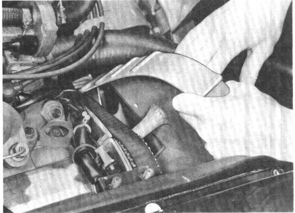 Drive belt tightness is correct when right mark is between both left marks and special tool rests on rear drive belt cover. (Engine must be positioned for this test as described in point 2.)