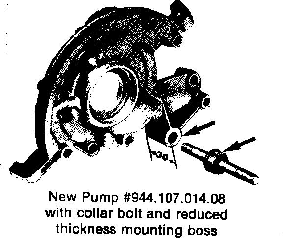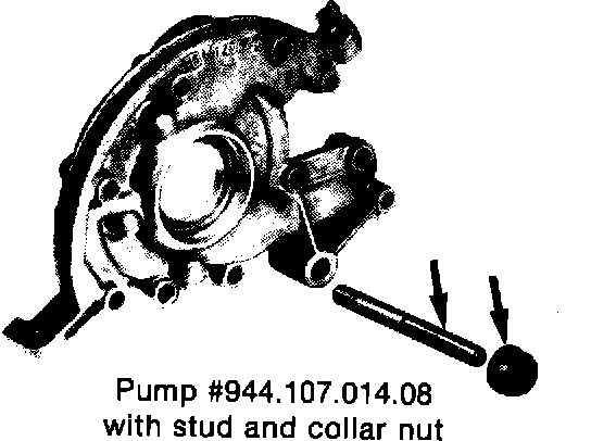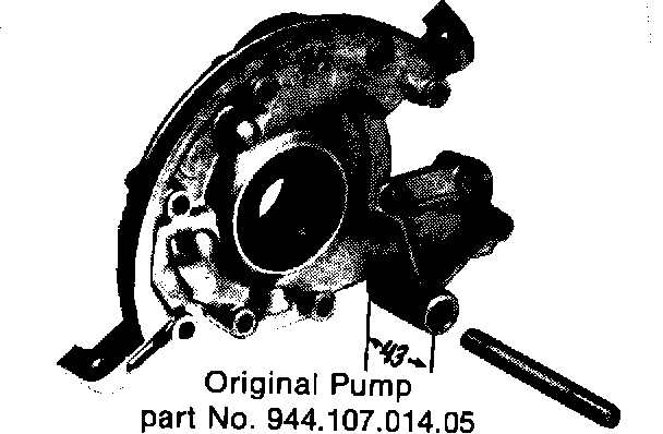 For engines produced prior to Sept. 3, 1984: When replacing the pump, order part # 944.107.014.05. This is the original pump with modified mounting. Also order stud, # 944.102.216.01 and collar nut # 944.102.243.00.