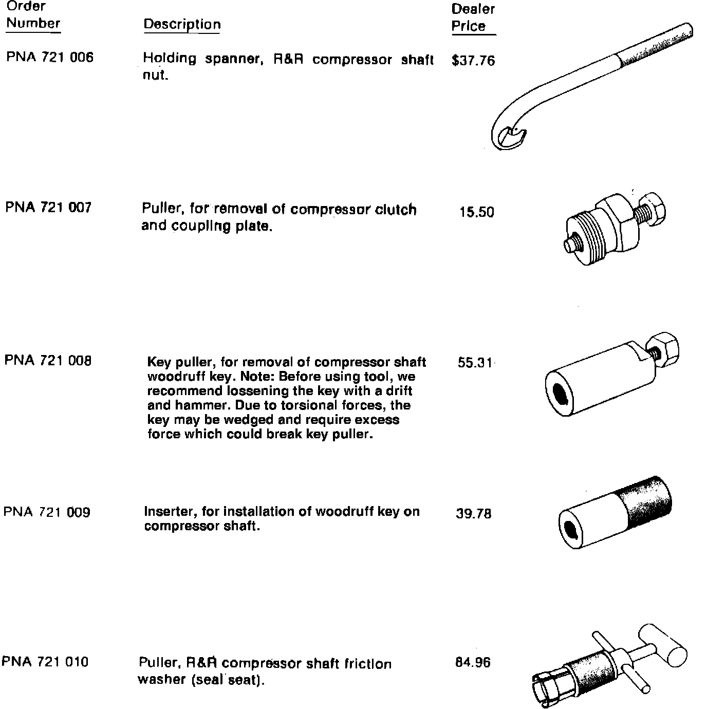 Below are listed those Special Tools needed to perform certain repairs on the Nippondenso 10 cylinder A/C compressor used on the 911 and 944 and also the 6 cylinder compressor used on the 928.